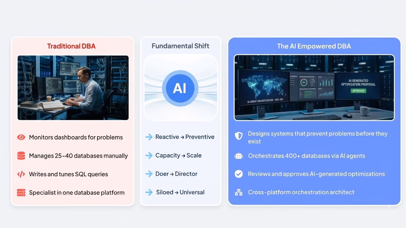 Reactive to Preventive. The best DBAs I've worked with have always had a sixth sense for problems they'd catch a pattern in query execution plans before it became an incident. AI can now do that continuously, across every workload, every hour of the day. We move from fighting fires to preventing them.