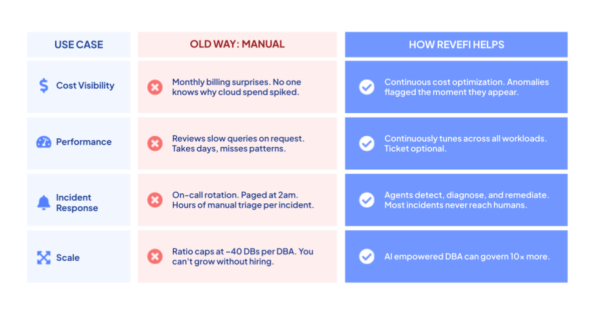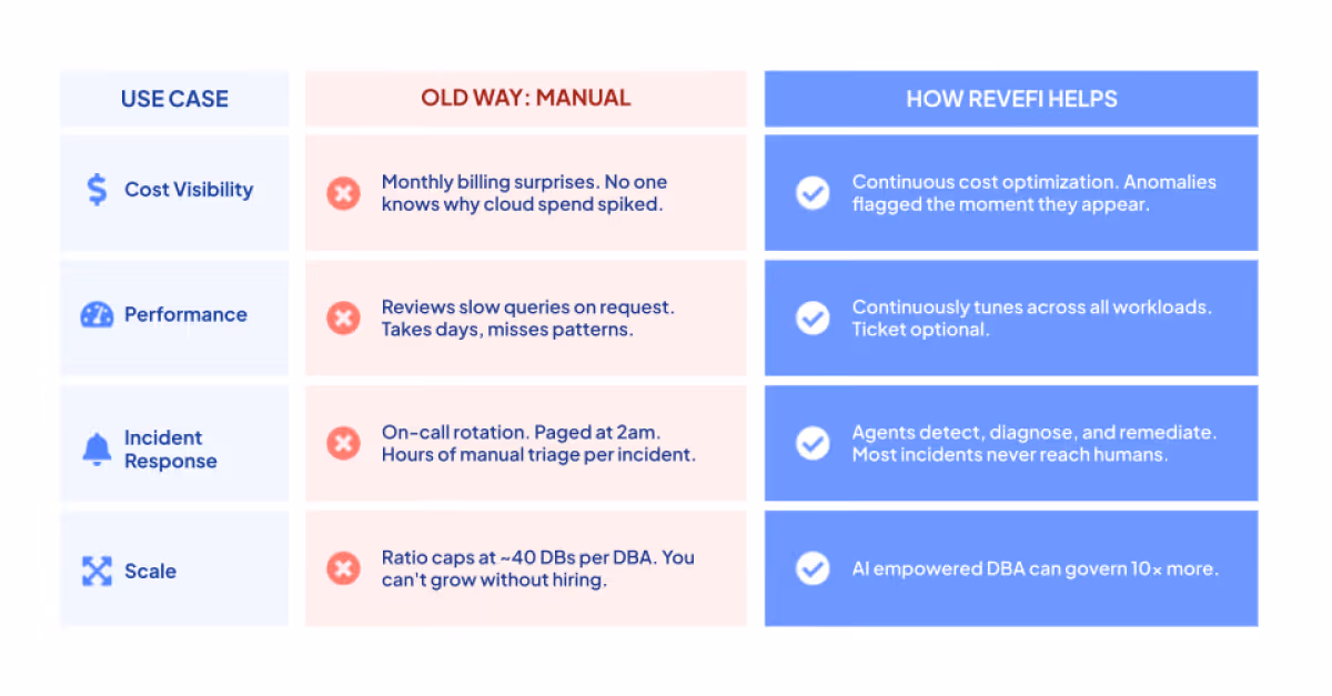 Capacity to Scale. A traditional DBA can effectively govern around 40 databases. With AI agents acting as force multipliers, that same DBA can oversee 400+. We're not replacing anyone, rather we're removing an artificial ceiling.