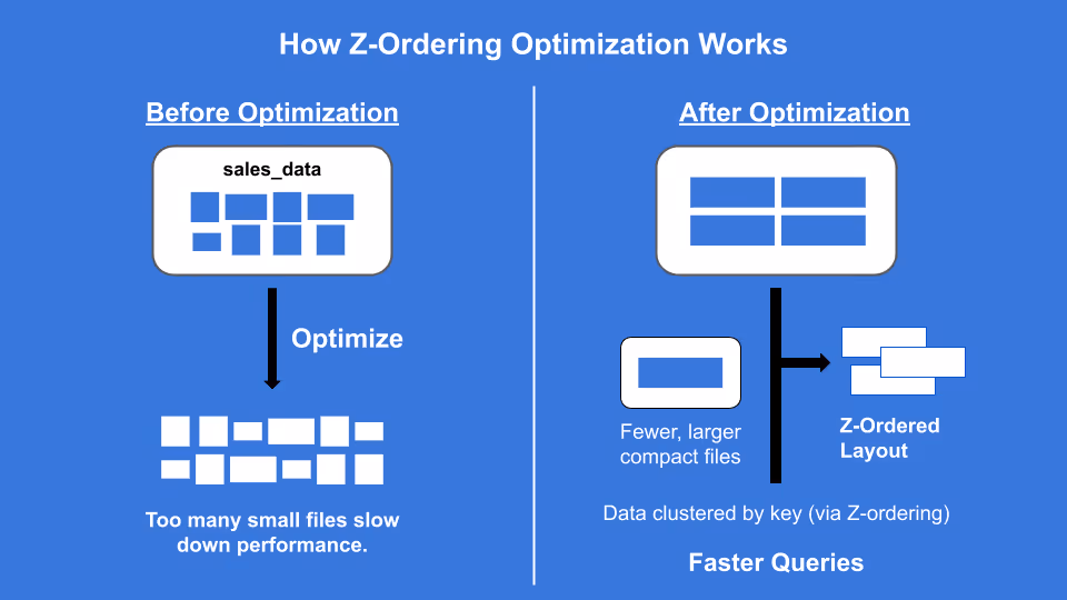 Use the OPTIMIZE command with ZORDER. This collocates related information in the same set of files - The Result: