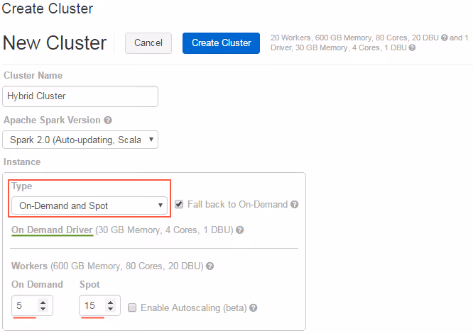 Configure clusters with a reliable On-Demand primary driver node for stability (ensuring the Spark driver doesn't get evicted) while using Spot worker nodes for scalable, interruptible compute. In Databricks, enable the "On-Demand and Spot" instance type option with fallback to On-Demand if Spot capacity is unavailable. Databricks gracefully handles spot node decommissioning by reassigning tasks or restarting them, minimizing job failures.