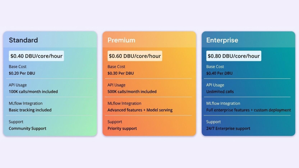 With Mosaic AI, Databricks extends its pricing model across the full generative AI lifecycle: model training, fine-tuning, vector storage, and real-time inference.