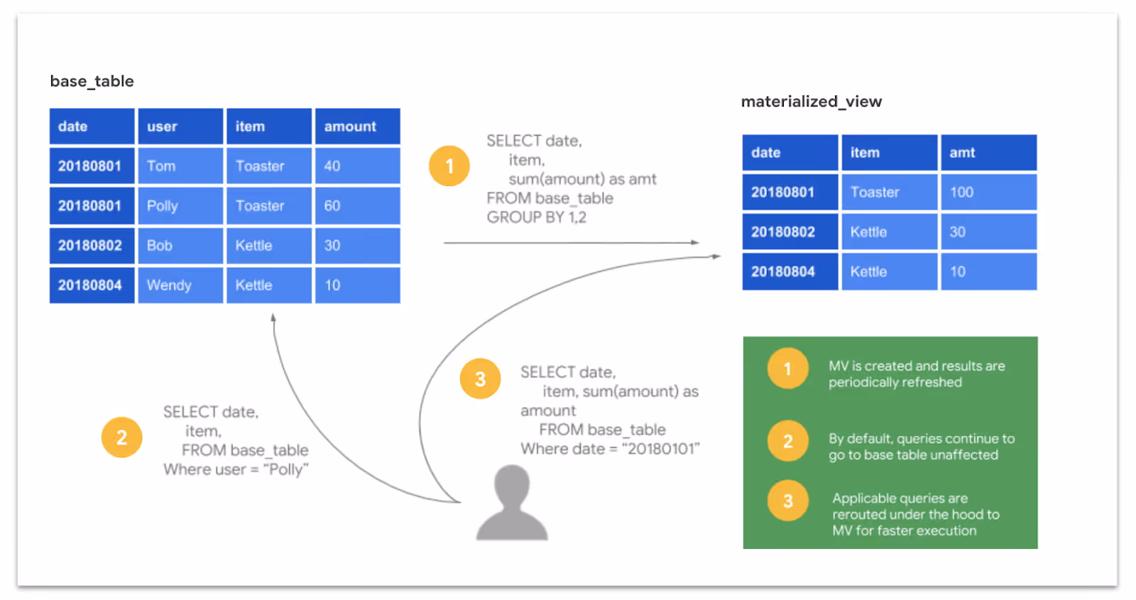 For dashboards that aggregate the same metrics daily (e.g., California regional sales or NYC user engagement), materialized views are essential. They pre-compute results and incrementally refresh, turning a billion-row scan into a lightning-fast lookup.