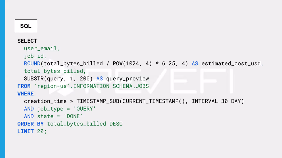 - The Power of INFORMATION_SCHEMA.JOBS: This view is essential for cost analysis. It tracks who ran what, when, how much data was scanned, and how long it took.