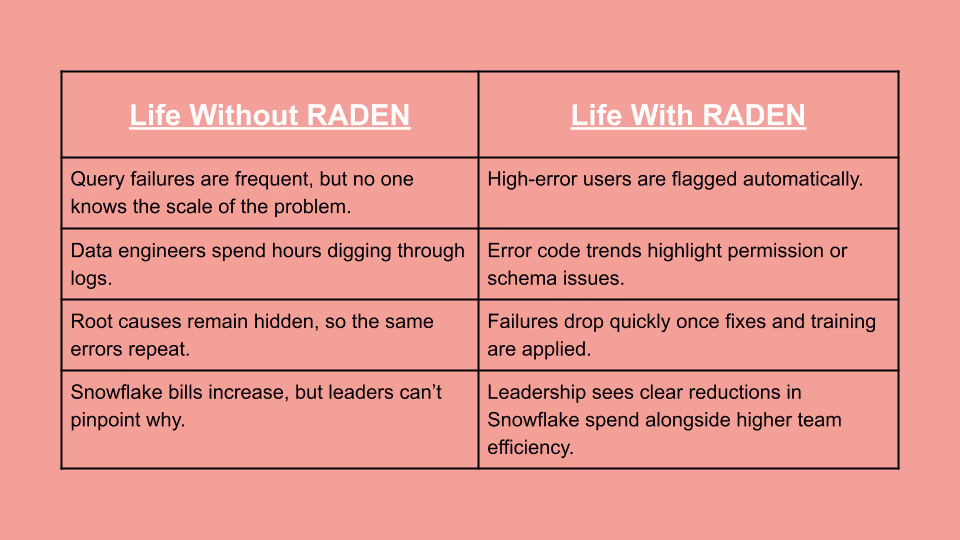 In today’s data-driven world, every Snowflake credit counts. With RADEN, you make sure they’re spent where they deliver the most value.