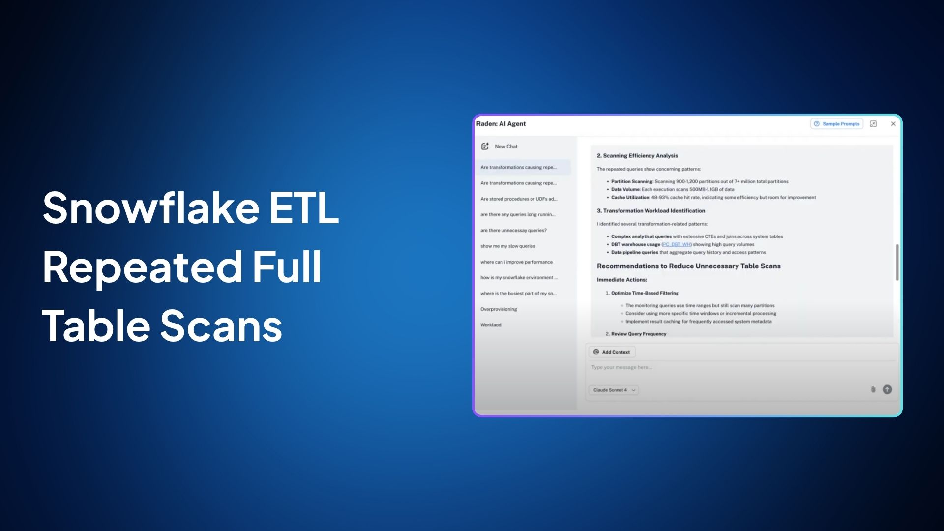 Take control of your Snowflake efficiency today with Revefi’s AI Agent! Watch this short video to see how Revefi’s AI Agent, RADEN, detects and analyzes transformations causing repeated full table scans that waste compute credits, slow down queries, and inflate costs across your Snowflake environment.